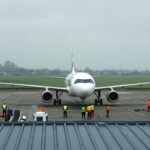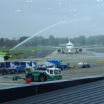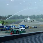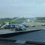 La aeronave que venía en vuelo desde la Patagonia tomo pista en el aeropuerto como estaba previsto a las 16.30. Como es costumbre en la aviación comercial cada vez que una aerolínea incorpora una aeronave o realiza una nueva ruta, la empresa se encarga de bautizarlo. La aeronave comienza su marcha y atraviesa por un arco de agua formado por dos camiones de bomberos, quedando completamente mojado previo a su partida. Luego, al arribar al punto de destino, también lo está esperando un nuevo arco acuático para finalizar el ritual. Una bella tradición que resulta atractiva de ver y que esconde todo un bagaje simbólico. Luego el avión tomo vuelo nuevamente hacia la ciudad de Neuquén con empresarios y directivos de la firma.