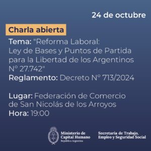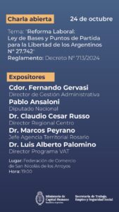 La charla sobre Reforma laboral y Ley de Bases se llevó a cabo según lo programado este jueves 25 de octubre a las 19:00 hs. La asistencia fue destacada, con un gran número de participantes tanto locales como de la región, lo que evidenció el interés que generan estos temas en el ámbito empresarial y profesional.