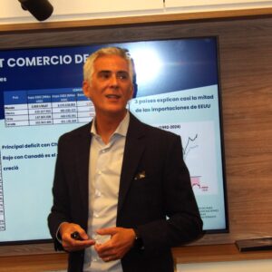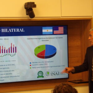 La presentación comenzó con un análisis del contexto internacional, realizado desde Fundación INAI, por Maximiliano Moreno quien destacó que dicha situación se encuentra actualmente caracterizada por una fuerte incertidumbre y volatilidad, lo cual está llamado a impactar en los flujos de comercio y las cadenas globales de valor. Las tensiones derivadas de las subas de aranceles deberían ajustarse en la medida que avancen positivamente los acuerdos entre EEUU y otros países, durante la ventana de negociación abierta por 90 días. La gran incertidumbre es cómo evolucionará la escalada de aranceles entre China y EEUU, tema que ha adquirido la centralidad esperada a partir de que EEUU fue acotando y enfocando el campo de aplicación de sus sanciones comerciales. De avanzar, este conflicto tiene el potencial de generar importantes desvíos de comercio en el sector agroindustrial, particularmente si tenemos en cuenta que EEUU es uno de los principales exportadores mundiales y China uno de los principales importadores.