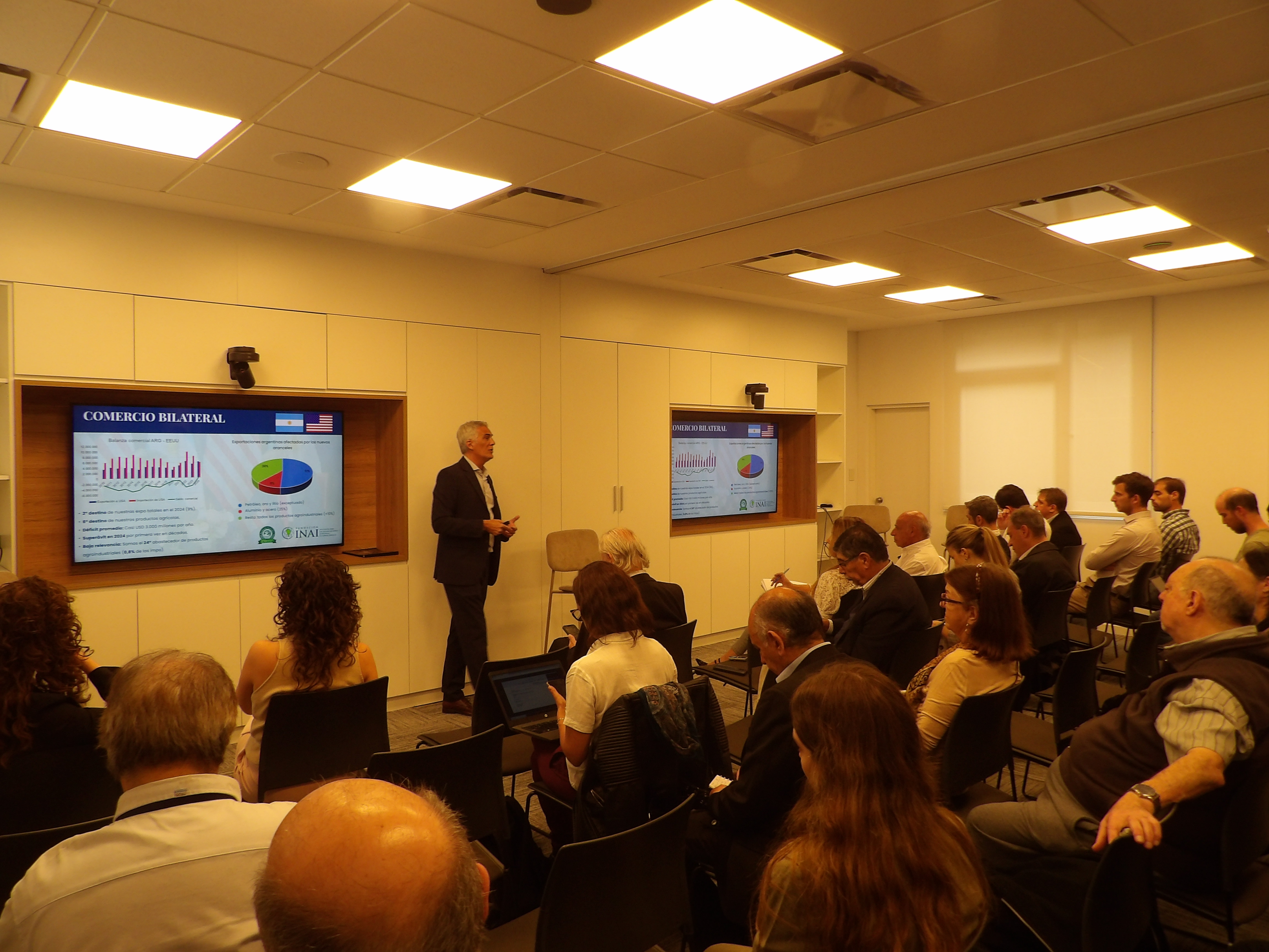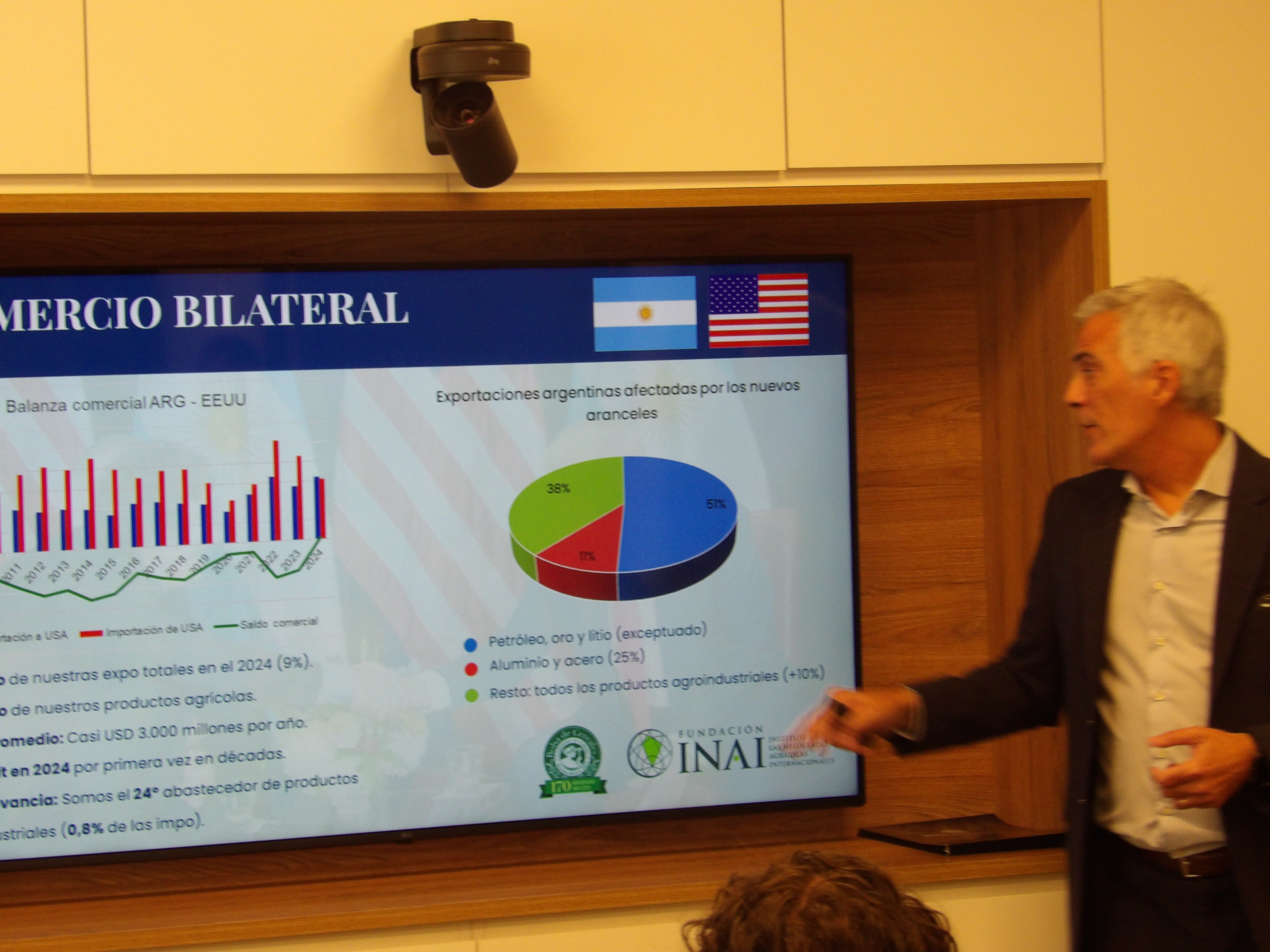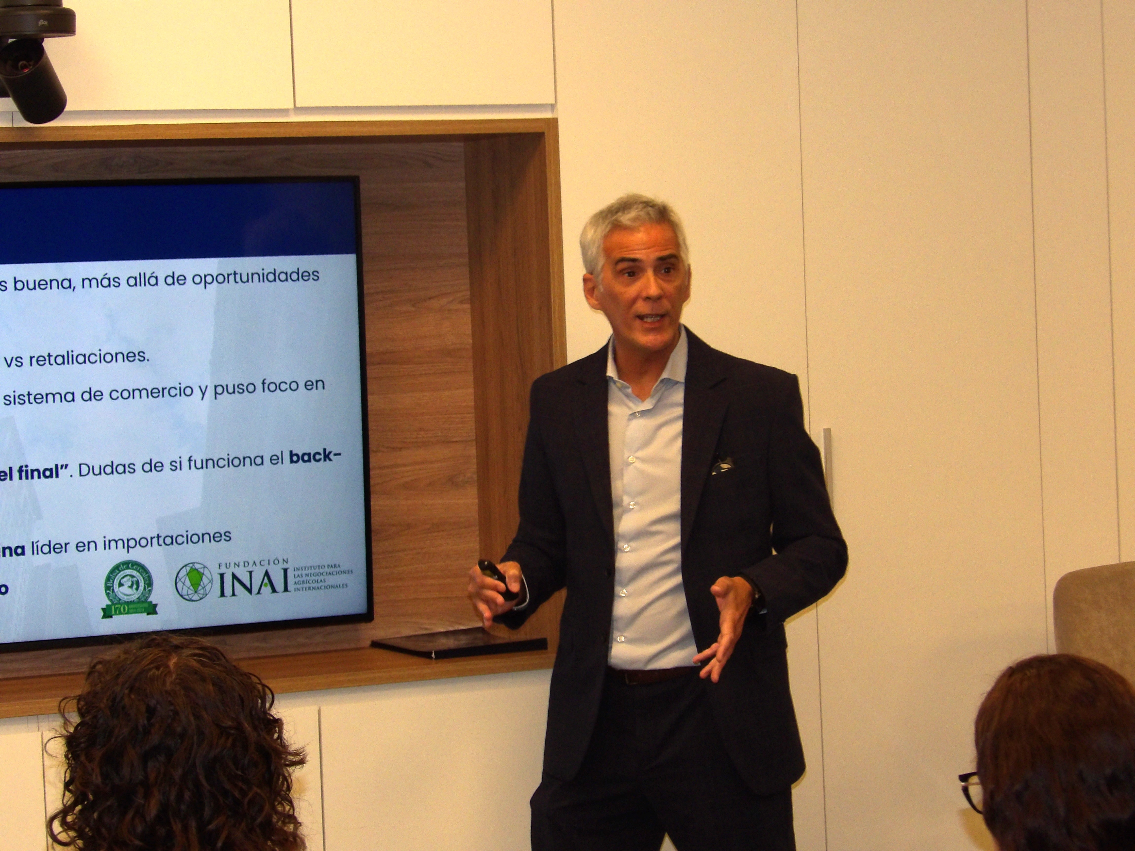 La presentación comenzó con un análisis del contexto internacional, realizado desde Fundación INAI, por Maximiliano Moreno quien destacó que dicha situación se encuentra actualmente caracterizada por una fuerte incertidumbre y volatilidad, lo cual está llamado a impactar en los flujos de comercio y las cadenas globales de valor. Las tensiones derivadas de las subas de aranceles deberían ajustarse en la medida que avancen positivamente los acuerdos entre EEUU y otros países, durante la ventana de negociación abierta por 90 días. La gran incertidumbre es cómo evolucionará la escalada de aranceles entre China y EEUU, tema que ha adquirido la centralidad esperada a partir de que EEUU fue acotando y enfocando el campo de aplicación de sus sanciones comerciales. De avanzar, este conflicto tiene el potencial de generar importantes desvíos de comercio en el sector agroindustrial, particularmente si tenemos en cuenta que EEUU es uno de los principales exportadores mundiales y China uno de los principales importadores.