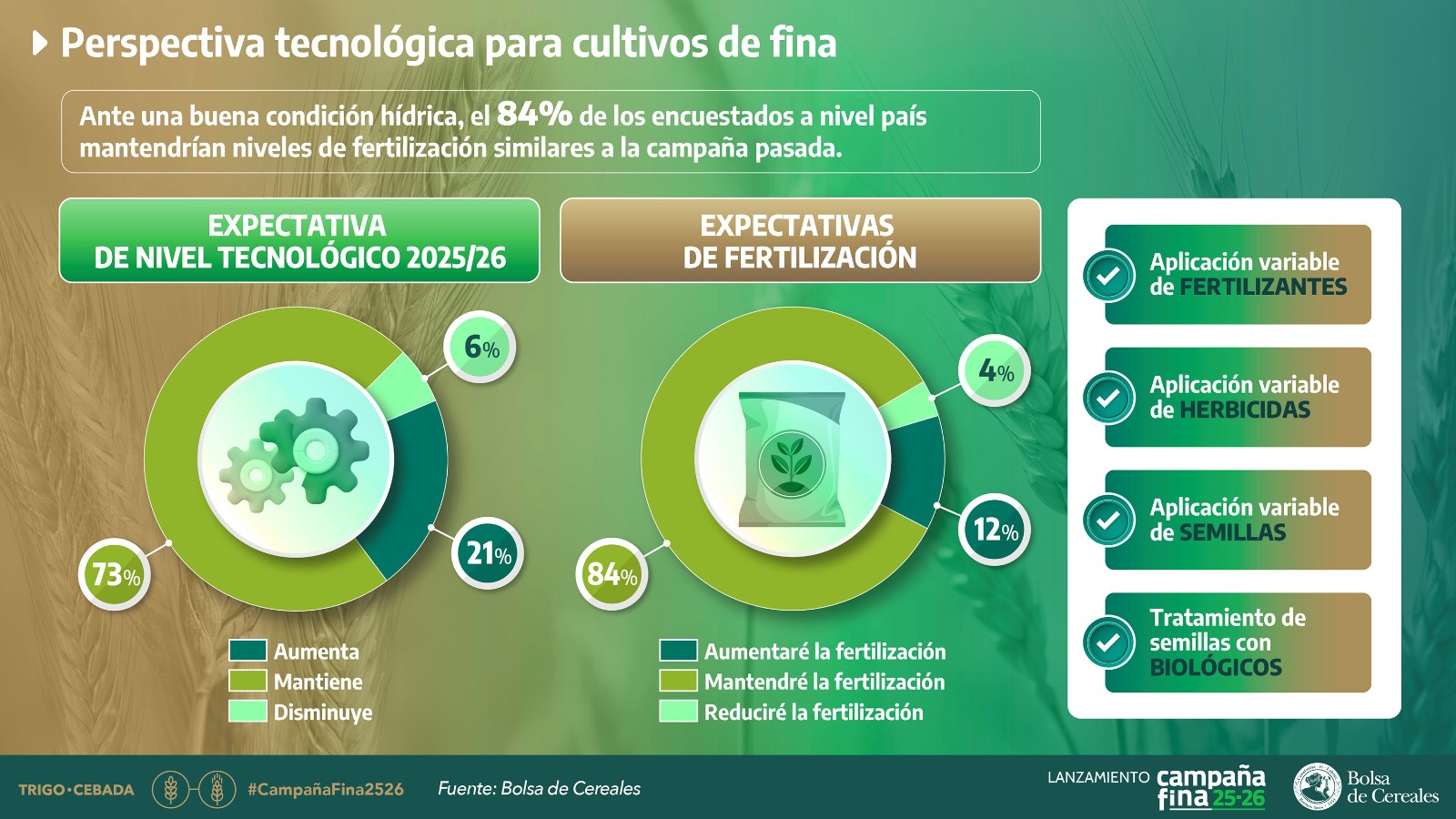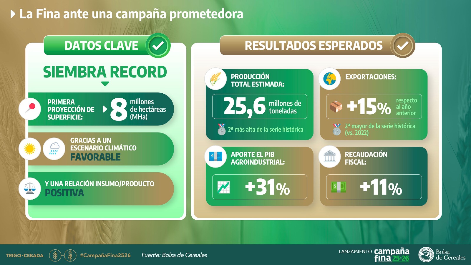 La Bolsa de Cereales realizó el Lanzamiento de la Campaña Fina 2025/26 presentando las primeras estimaciones para trigo y cebada para el próximo ciclo. Con un clima que se presenta favorable para la siembra, y con una ecuación económica que permite mantener los planteos tecnológicos promedios, se espera que el área sembrada de trigo alcance los 6,7 millones de hectáreas, con una producción estimada en 20,5 millones de toneladas. Mientras que la superficie destinada a la cebada se ubica en 1,3 millones de hectáreas, con una producción proyectada de 5,1 millones de toneladas.