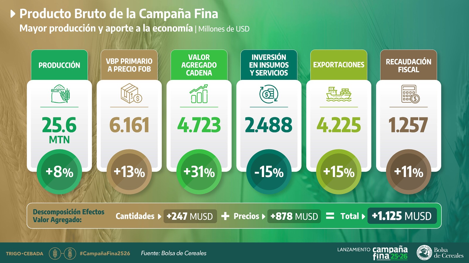 Finalmente, al presentar las cifras de aporte económico de ambas cadenas, Ramiro Costa, destacó que el valor agregado de las cadenas de trigo y cebada se estima en 4.723 millones de dólares, lo que representa un incremento del 31% respecto a la campaña anterior. Este aumento se puede atribuir, en parte, a la expansión de la superficie cultivada y del volumen producido, así como al efecto positivo de la relación entre los precios del trigo y sus costos de producción. Adicionalmente, se proyecta que las exportaciones de estos cereales experimenten una mejora del 15%, alcanzando un valor de 4.225 millones de dólares.