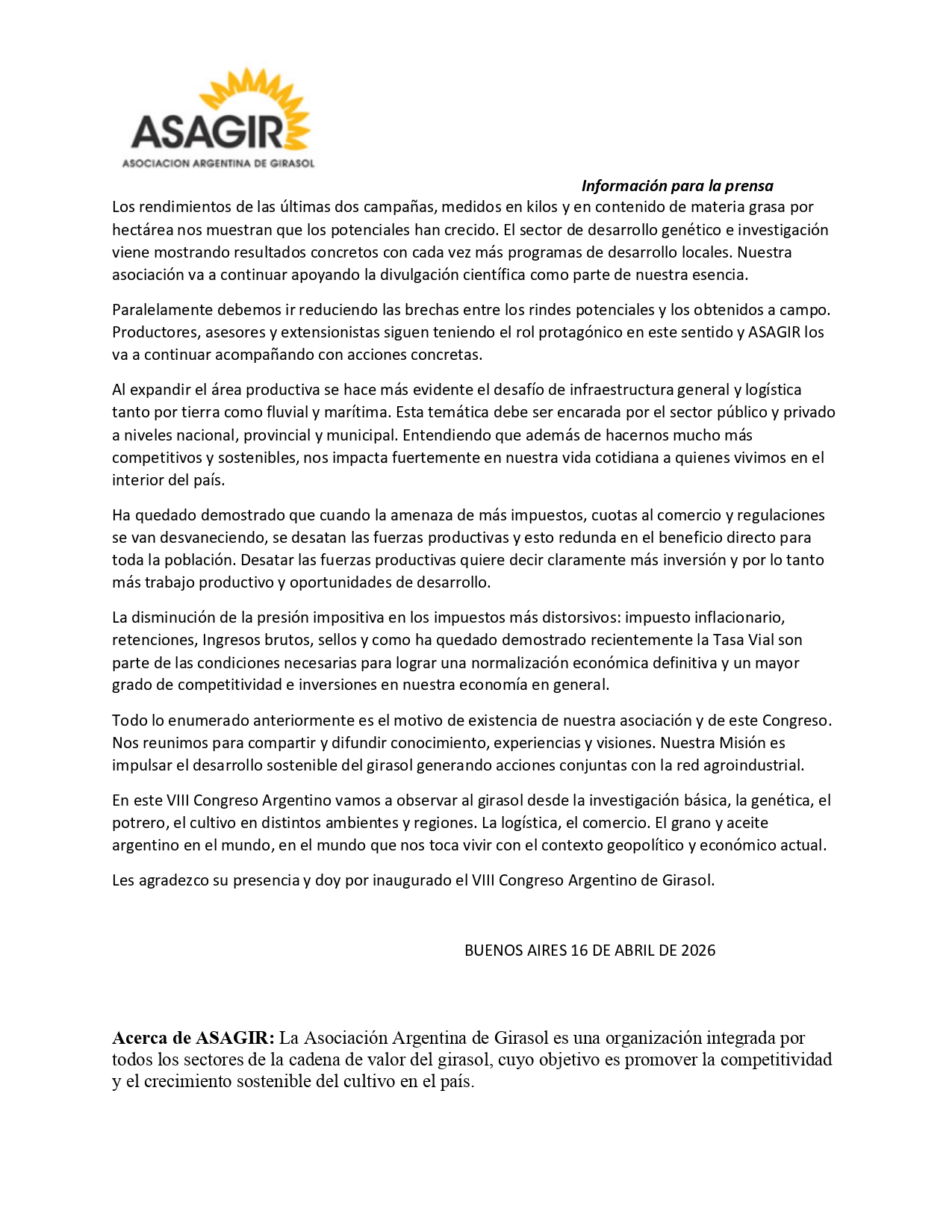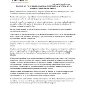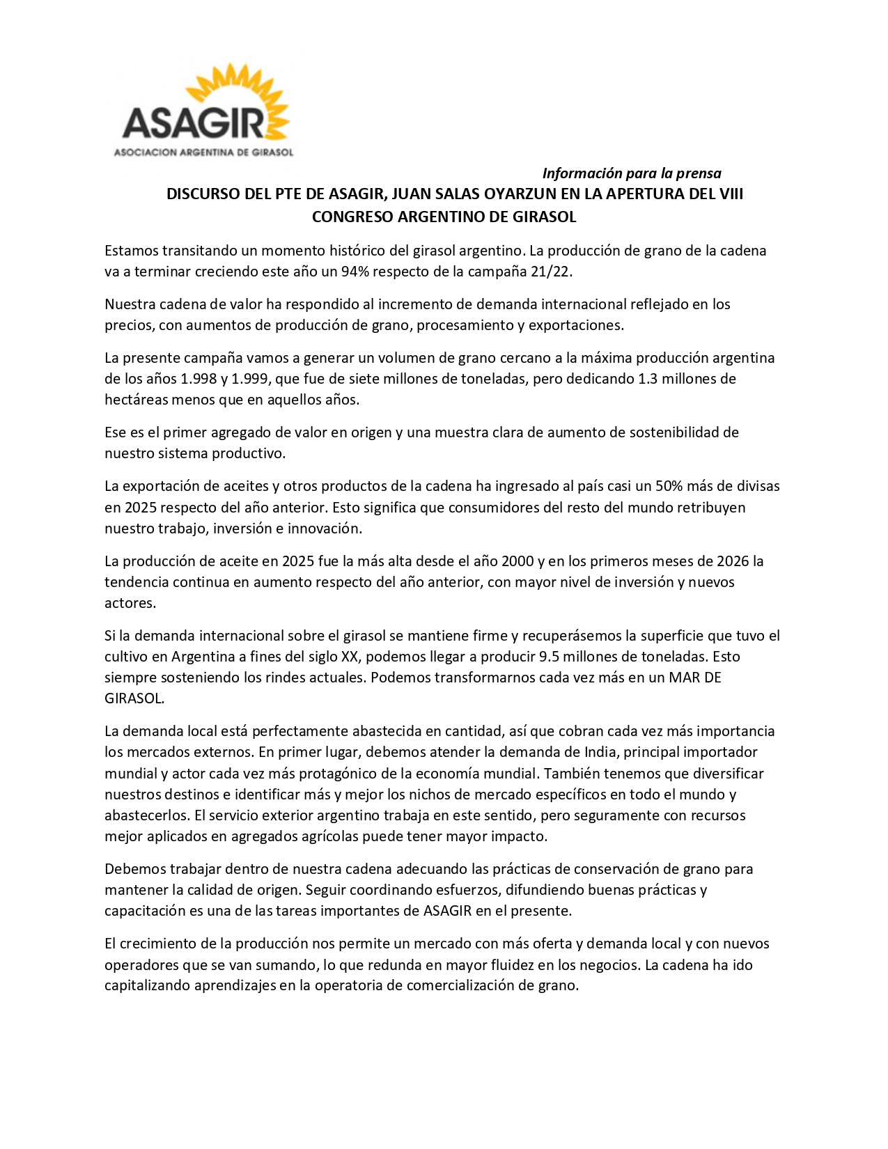 DISCURSO DEL PTE DE ASAGIR, JUAN SALAS OYARZUN EN LA APERTURA DEL VIII CONGRESO ARGENTINO DE GIRASOL