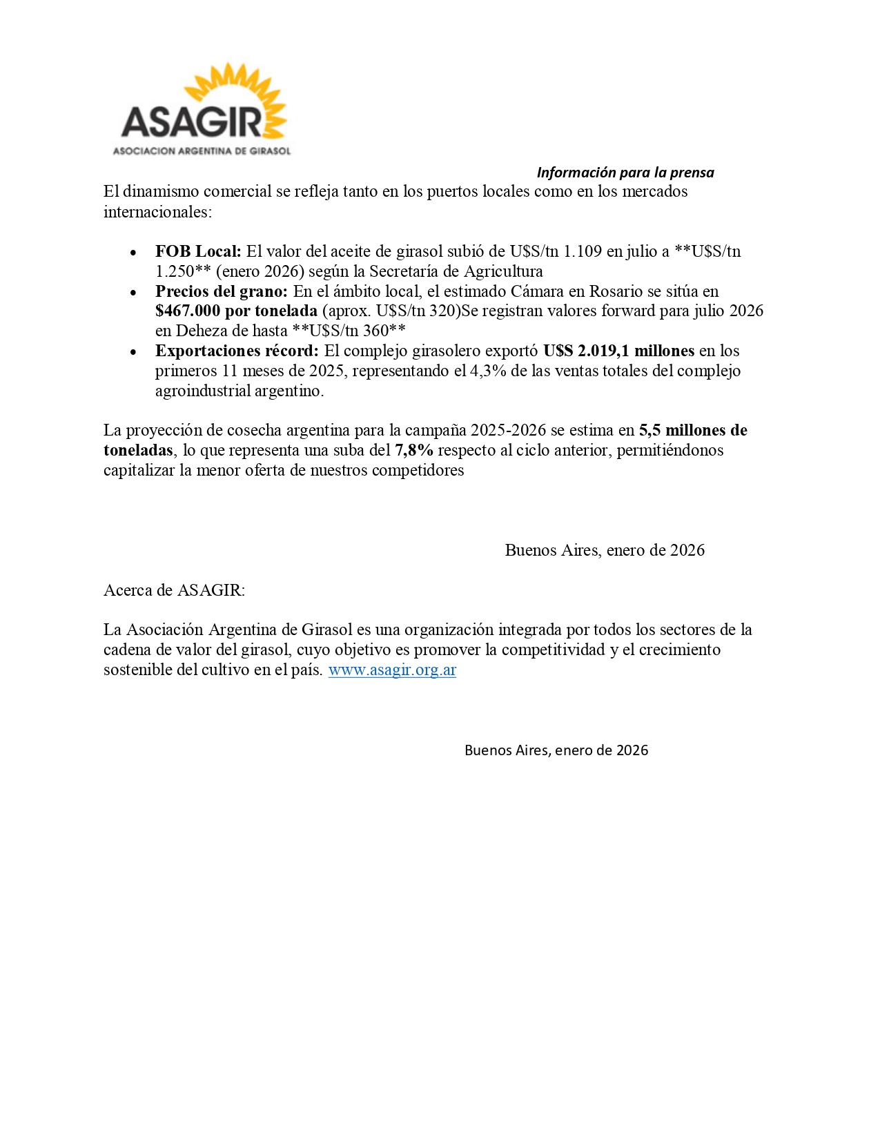 La Asociación Argentina de Girasol (ASAGIR) presenta el último informe de coyuntura elaborado por su asesor económico, el Lic. Jorge Ingaramo, que destaca el excelente desempeño del complejo girasolero local. Con un incremento del 46,8% en el valor de las exportaciones entre enero y noviembre de 2025 y una suba del 11% en el precio FOB local en los últimos seis meses, el sector reafirma su posición estratégica en la economía argentina.
