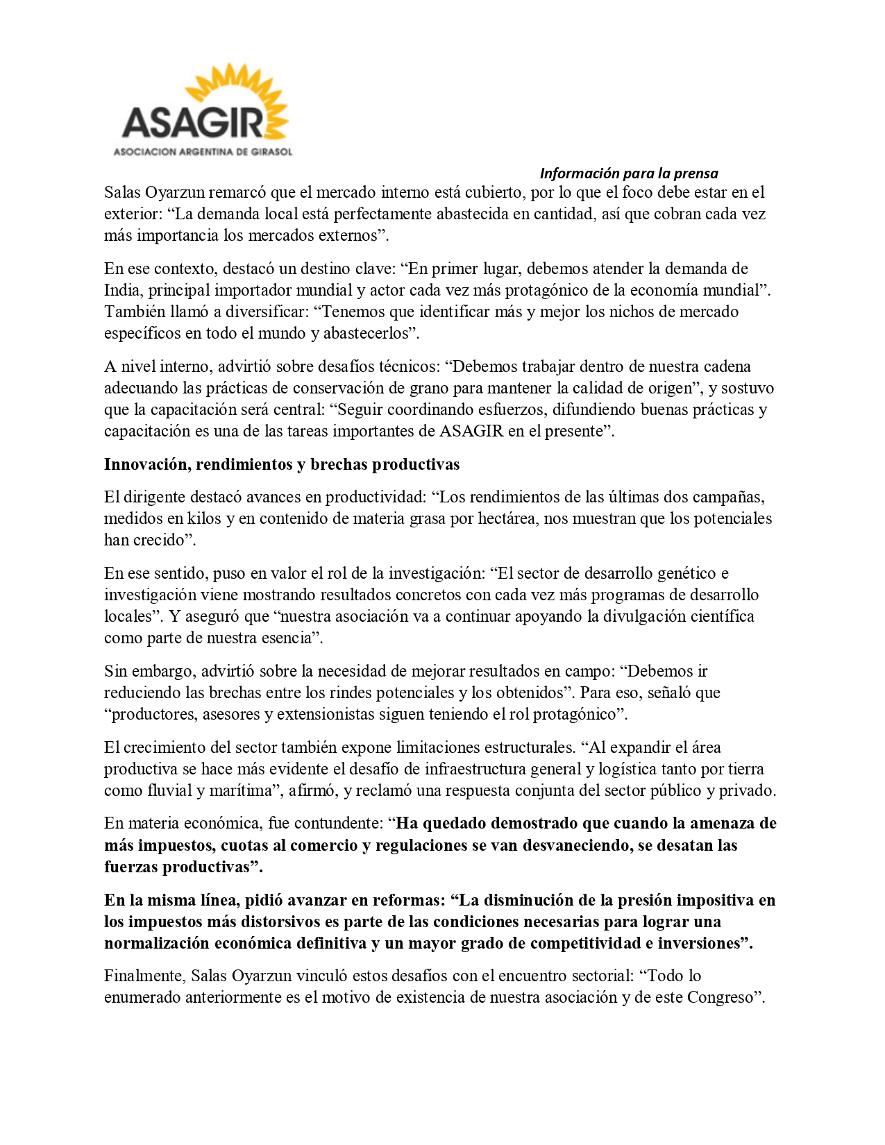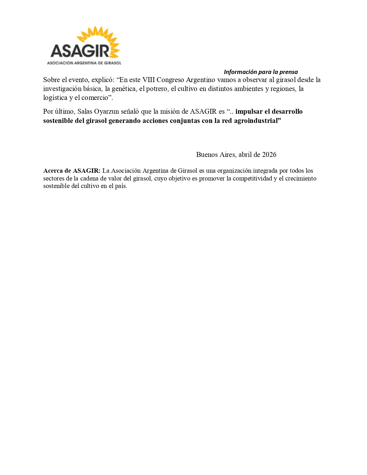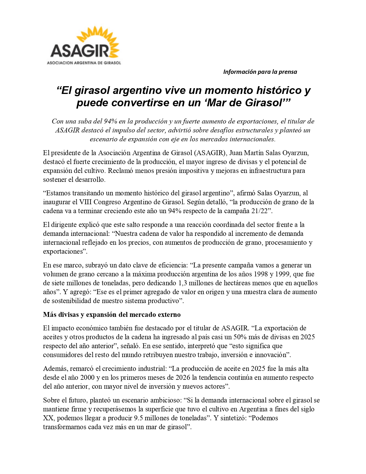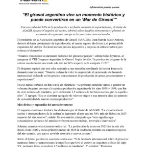 Con una suba del 94% en la producción y un fuerte aumento de exportaciones, el titular de ASAGIR destacó el impulso del sector, advirtió sobre desafíos estructurales y planteó un escenario de expansión con eje en los mercados internacionales. El presidente de la Asociación Argentina de Girasol (ASAGIR), Juan Martín Salas Oyarzun, destacó el fuerte crecimiento de la producción, el mayor ingreso de divisas y el potencial de expansión del cultivo. Reclamó menos presión impositiva y mejoras en infraestructura para sostener el desarrollo.