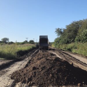 El trabajo que se realiza es estabilizado y entoscado de suelo para luego agregar escoria. A la vez avanza con un plan de bacheo en todo el partido de Ramallo.