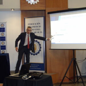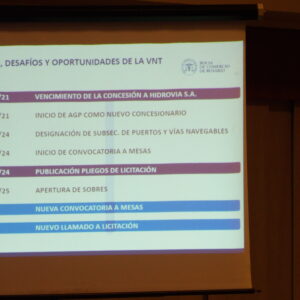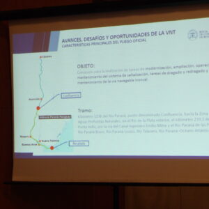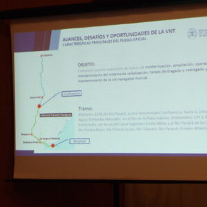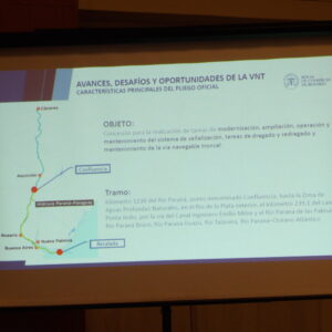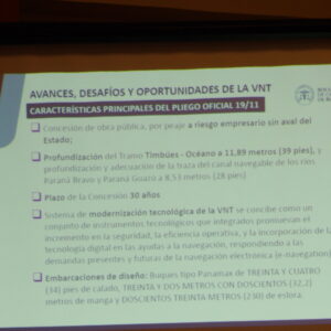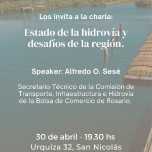 El 30 de abril por la tarde, se llevó a cabo la charla titulada “El Estado de la Hidrovía y los Desafíos de la Región”. La disertación estuvo a cargo de Alfredo O. Sesé, Secretario Técnico de la Comisión de Transporte, Infraestructura e Hidrovía de la Bolsa de Comercio de Rosario. Un auditorio compuesto por personas comprometidas y con un sólido conocimiento sobre el tema escuchó con atención el informe presentado por los técnicos, el cual abordó principalmente la reciente caída de la licitación y la demora en la presentación de una nueva propuesta para la Hidrovía, así como las implicancias derivadas de este retraso.