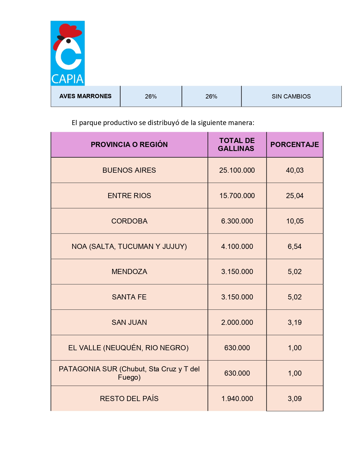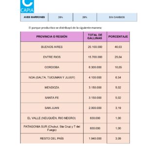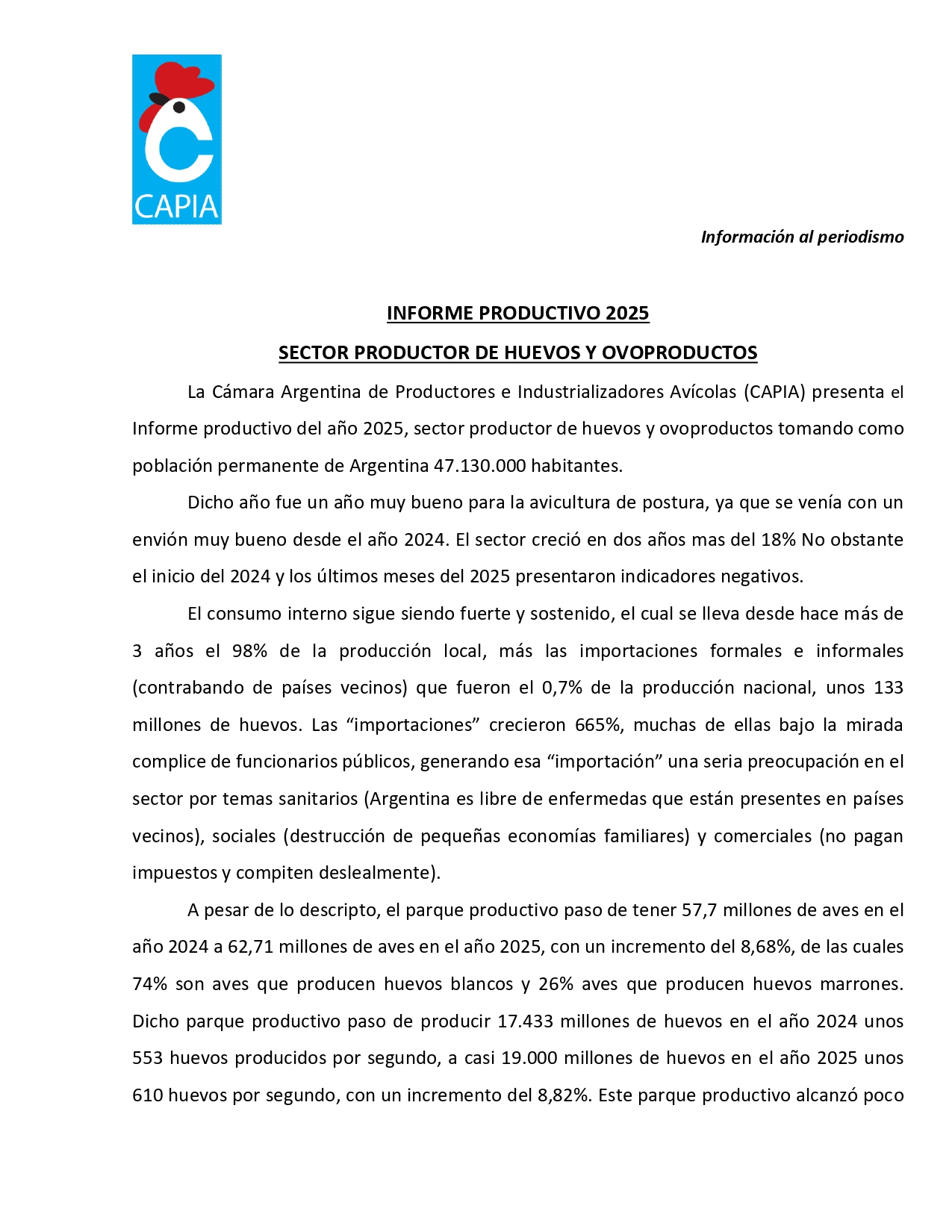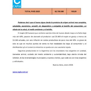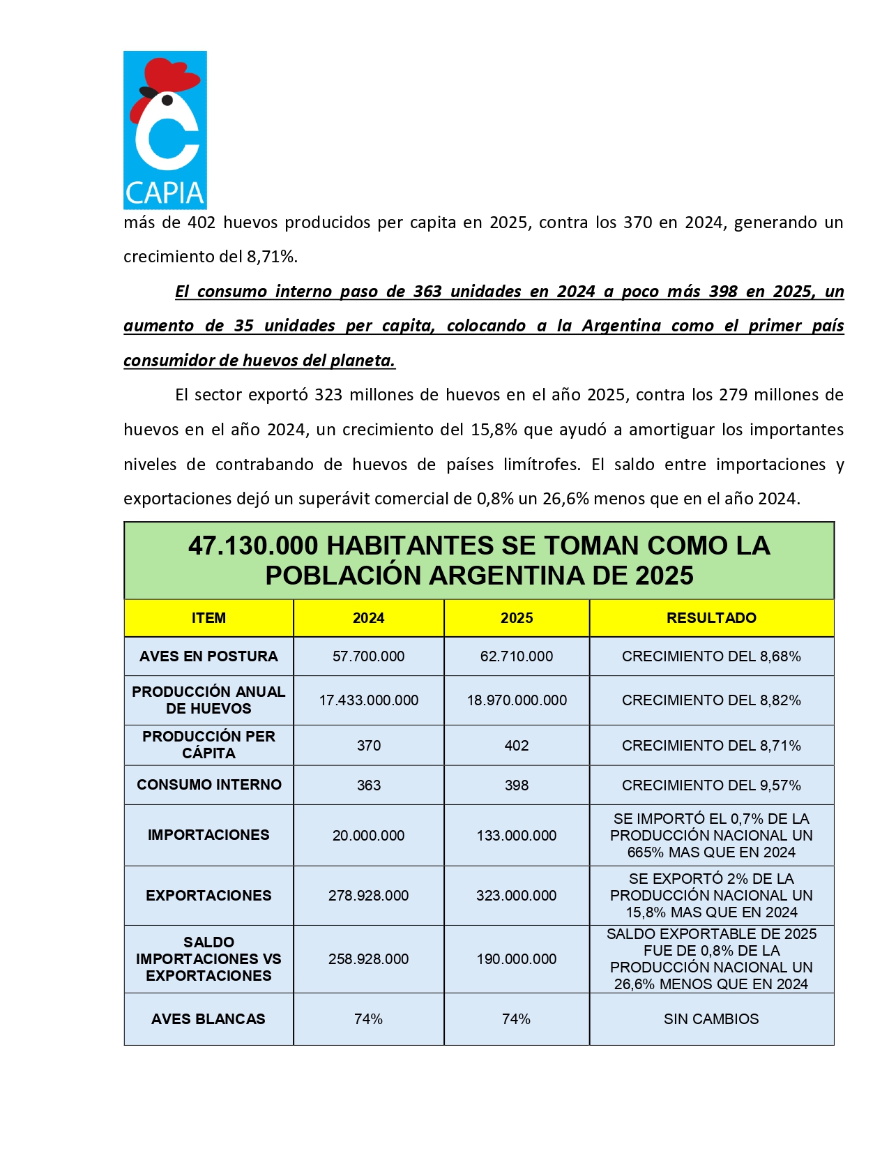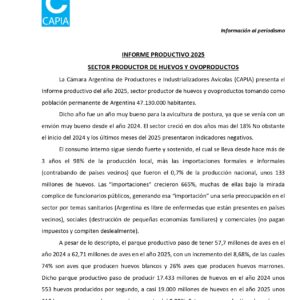 La Cámara Argentina de Productores e Industrializadores Avícolas (CAPIA) presenta el Informe productivo del año 2025, sector productor de huevos y ovoproductos tomando como población permanente de Argentina 47.130.000 habitantes.