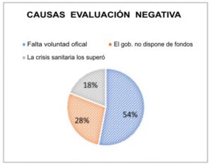 En cuanto a las causas de la evaluación negativa, para el 54 % hubo falta de voluntad oficial; para el 28 % el gobierno no dispone de fondos, en tanto que para el 19 % la situación de emergencia sanitaria superó al Gobierno.
