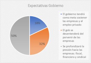 Expectativas Gobierno. La economía se mueve por expectativas, por lo queéste es el eje más relevante del presente estudio.A grandes rasgos, puede inferirse que los empresarios prevén un horizonte complejo a nivel contextual; descreen de un futuro promisorio par el país, pero en un % significativo confía que a su empresa le irá mejor en promedio de lo que le vaya a la Argentina. Cuando se les consultóqué rol creen que asumirá el gobierno en relación con las empresas una vez que la pandemia pase, sólo el 18% cree que el gobierno tendrá como meta sostener las empresas y el empleo privado. Para el 32 %, se desentenderá del porvenir de las empresas, en tanto que para el 50 % se profundizará la presión hacia las empresas: fiscal, financiera y sindical.