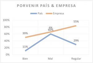 Expectativas País & Empresa. En vistas de comprender el humor o clima país, resulta de gran valor conocer la percepción de los entrevistados acerca de cómo creen que le irá a la Argentina. Sólo para el 11 % a la Argentina le irá bien, para el 29 % le irá regular, en tanto que de acuerdo al 60 % le irá mal. “Cuando cruzamos esa sensación con las expectativas en relación al porvenir de su propia empresa, su metro cuadrado, encontramos un cambio positivo en las expectativas”, dice Orcinoli, para quien “no es un dato menor teniendo en cuenta el contexto de crisis económica y de humor o clima social negativo” Para el 39 % le irá mejor que al país; sólo para el 6 % le irá peor, en tanto que para el 55 % le irá igual.