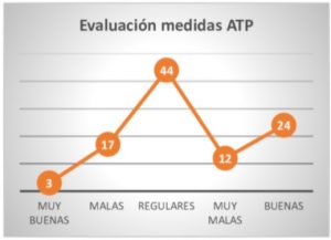 Evaluación de medidas ATP. Cuando se preguntó a los empresarios Pyme cómo evalúan las medidas tomadas por el gobierno que, enmarcadas en el programa Asistencia al Trabajo y la Producción (ATP), pretenden aliviar económicamente a las empresas, las respuestas fueron categóricas. Para el 44 % las medidas fueron regulares; para los 17 % malas, para el 12 % fueron muy malas, en tanto que para los 24 % buenas y para el 3 % muy buena.