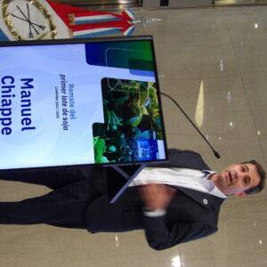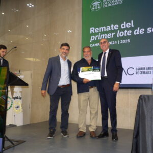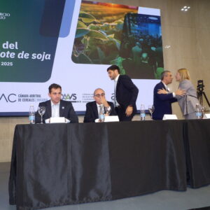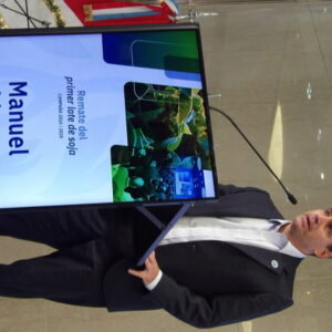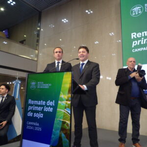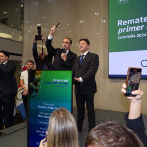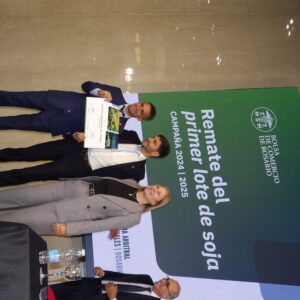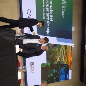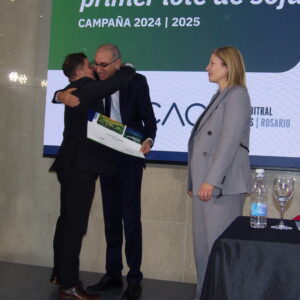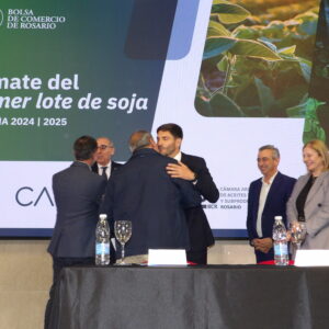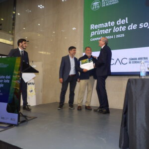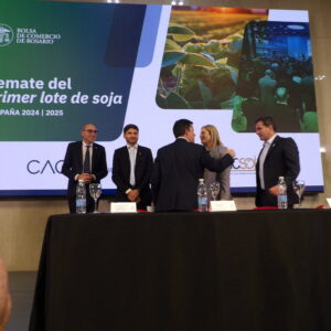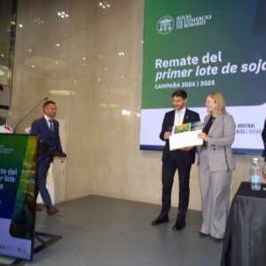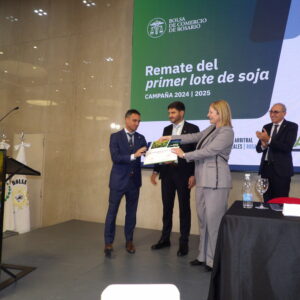 Arribó a Rosario el Primer lote de soja de la nueva campaña 2024/25 Por tercera vez en la historia del certamen la partida ganadora proviene de la provincia de Córdoba. La subasta se realizó el viernes 25 de abril, en el Recinto de Operaciones de la BCR. La Bolsa de Comercio de Rosario anunció el arribo del Primer lote de soja de la campaña 2024/25. Según lo establecido en el reglamento, recibidores oficiales de su Cámara Arbitral actuaron sobre la mercadería descargada en la planta de Cofco, ubicada en Timbúes. Luego del análisis, realizado en los laboratorios de la BCR, se determinó que la partida cumplió con la norma de calidad para la comercialización de soja. El lote fue producido por Fedor José Espinosa, en un campo de 42 hectáreas ubicadas en la localidad cordobesa de Monte Buey, a casi 200 kilómetros de Rosario. Su fecha de siembra fue el 31 de octubre de 2024, mientras que la cosecha tuvo lugar el 21 de marzo de este año. La producción estimada fue de 45 quintales por hectárea, de la variedad DM33R22. Vale destacar que por tercera vez en la historia del certamen, que comenzó con la campaña 1987/88, el lote ganador arriba desde Córdoba. La última vez que se subastó mercadería de esa provincia fue en la edición 2013/14, proveniente de Leones. Mientras que el evento correspondiente a la campaña 2008/09 fue realizado con un lote cosechado en Ballesteros. La cooperativa Agricultores Federados Argentinos (AFA) intervino como consignatario. En tanto, la rma Gualtieri e Hijos actuó como entregador en la descarga de la mercadería. El lote ganador se remató en la Bolsa de Comercio de Rosario el 25 de abril , en un acto que marcó el inicio formal de la comercialización de soja de la nueva campaña. La actividad contó con la participación de autoridades de gobierno nacional, provincial y municipal, directivos y asociados de la BCR y representantes de toda la cadena de comercialización de la oleaginosa.