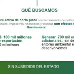 Esta iniciativa busca alcanzar los U$S 100 mil millones anuales de exportación, (hoy en un valor de U$S 65 mil millones)y generar 700 mil empleos adicionales, sin descuidar el entorno ambiental en el que desenvuelve la agroindustria.