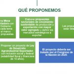 Para ello, se plantea conformar una Mesa Nacional Exportadora con diversas áreas del Gobierno Nacional; elaborar propuestas sectoriales de crecimiento sustentable de producciónón y exportaciónón con mayor valor agregado y definir los mercados estratégicos a exportar; y proveer un Proyecto de Ley de Desarrollo Agroindustrial Exportador, con inclusión social y federal (que contemple una estabilidad fiscal y financiera de 10 años).